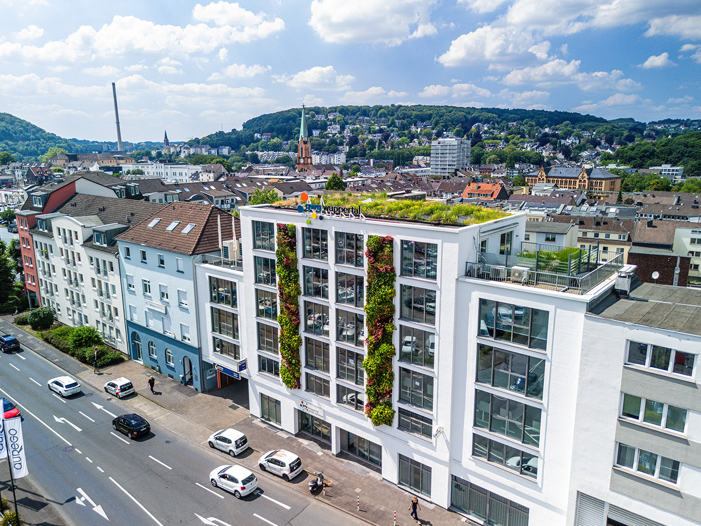 Im Zuge einer energetischen Sanierung wurde an der Hauptverwaltung der GWG eine rund 60 Quadratmeter große Fassadenbegrünung in Form zweier Living Walls realisiert. Zum Einsatz kam das Vertiko LivingWall System, eine vorgehängte hinterlüftete Vlies-Substrat-Konstruktion.