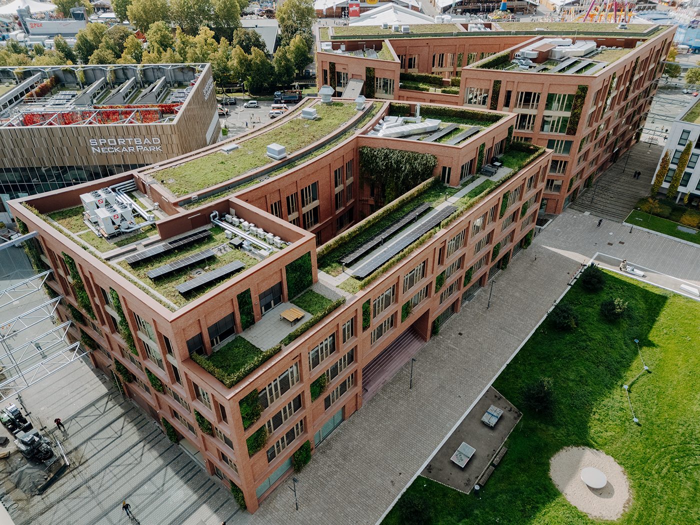 Mit dem Gebäudekomplex Q8 entstand im Stuttgarter Neckarpark der südliche Abschluss eines neuen Stadtquartiers. Die Firma Leonhards realisierte die komplette Dach- und Fassadenbegrünung in einer Arbeitsgemeinschaft mit der Firma Garten Moser aus Reutlingen.